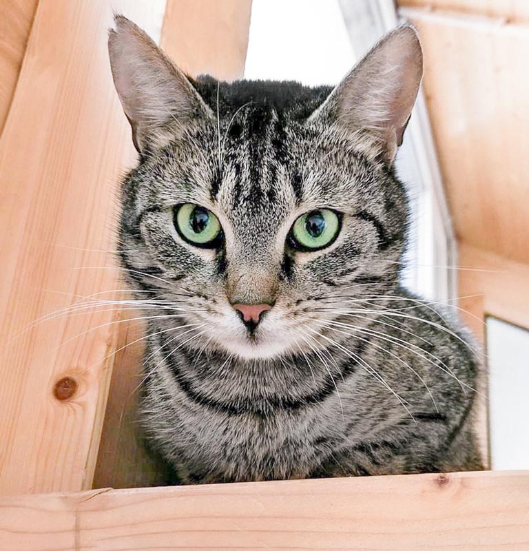 Er lebt bei uns meistens auf den Deckenbalken und kuschelt mit einem seiner Fellkumpels, gegenüber denen er sehr aufgeschlossen ist. Daher wäre ein Heim mit einem bereits vorhandenem, freundlichen und zutraulichen Freund perfekt für ihn.